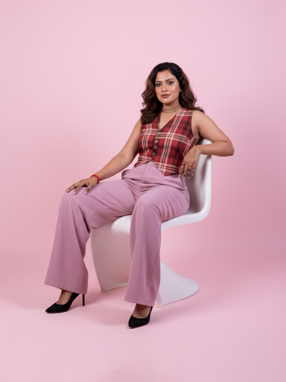 Introducing the Berry Rose Co-ord Set – a timeless blend of elegance and comfort. Crafted in 100% pure cotton, this two-piece set includes a sleeveless plaid vest top with a flattering V-neckline, button-down front, and adjustable tie-back detail, paired with high-waist blush pink wide-leg trousers.